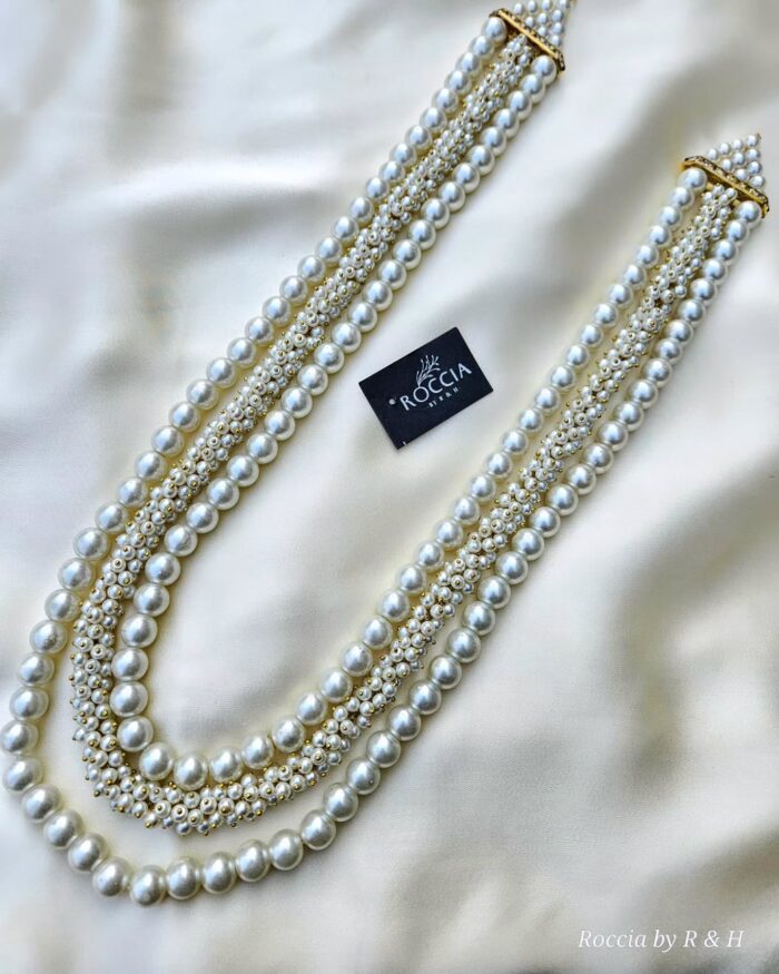 Pearl Maala –A timeless piece of traditional jewellery, the Pearl Maala showcases exquisite craftsmanship with finely set Kundan stones. Designed to add regal charm, this maala is perfect for weddings, festive occasions, and cultural celebrations. Its intricate detailing and graceful finish make it a statement accessory that complements ethnic and bridal attire.