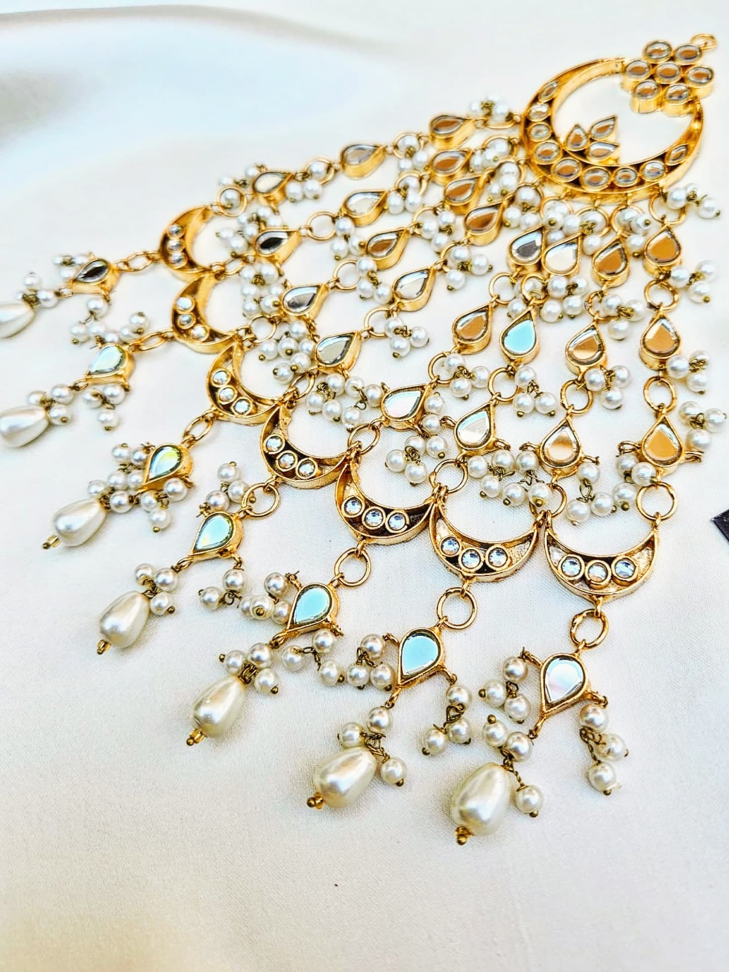 Farshi Kundan Jhoomar – A regal bridal adornment featuring intricate Kundan work and a graceful farshi trail. Perfectly blending Mughal elegance with timeless tradition, it adds unmatched grandeur and sophistication to every bridal look.