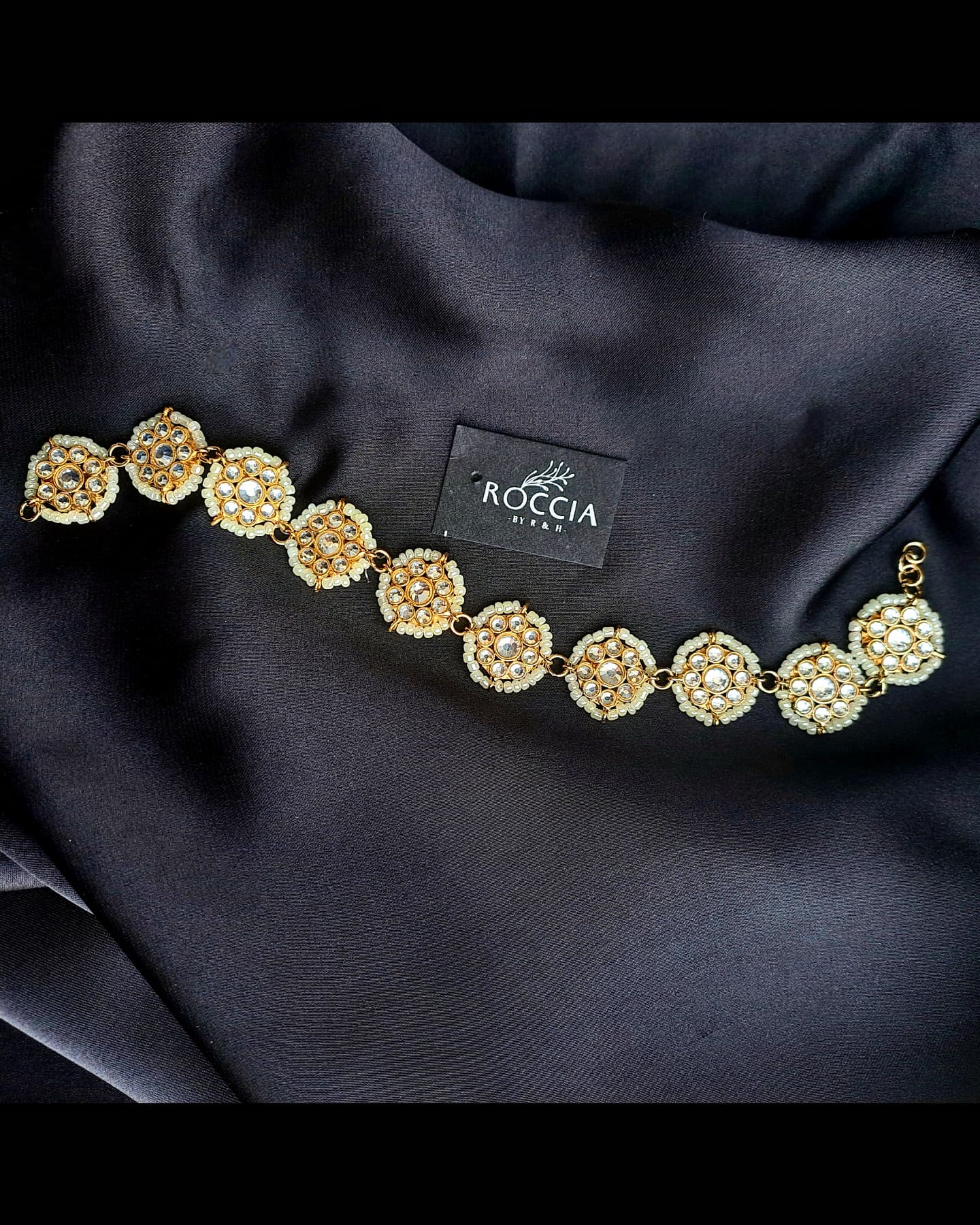 Embrace timeless beauty with our Farshi Kundan Sheeshpatti, a headpiece that exudes royalty and grace. Expertly handcrafted, this exquisite piece features intricate high-end Kundan work set in a stunning farshi design, perfect for adding a regal touch to your attire.
