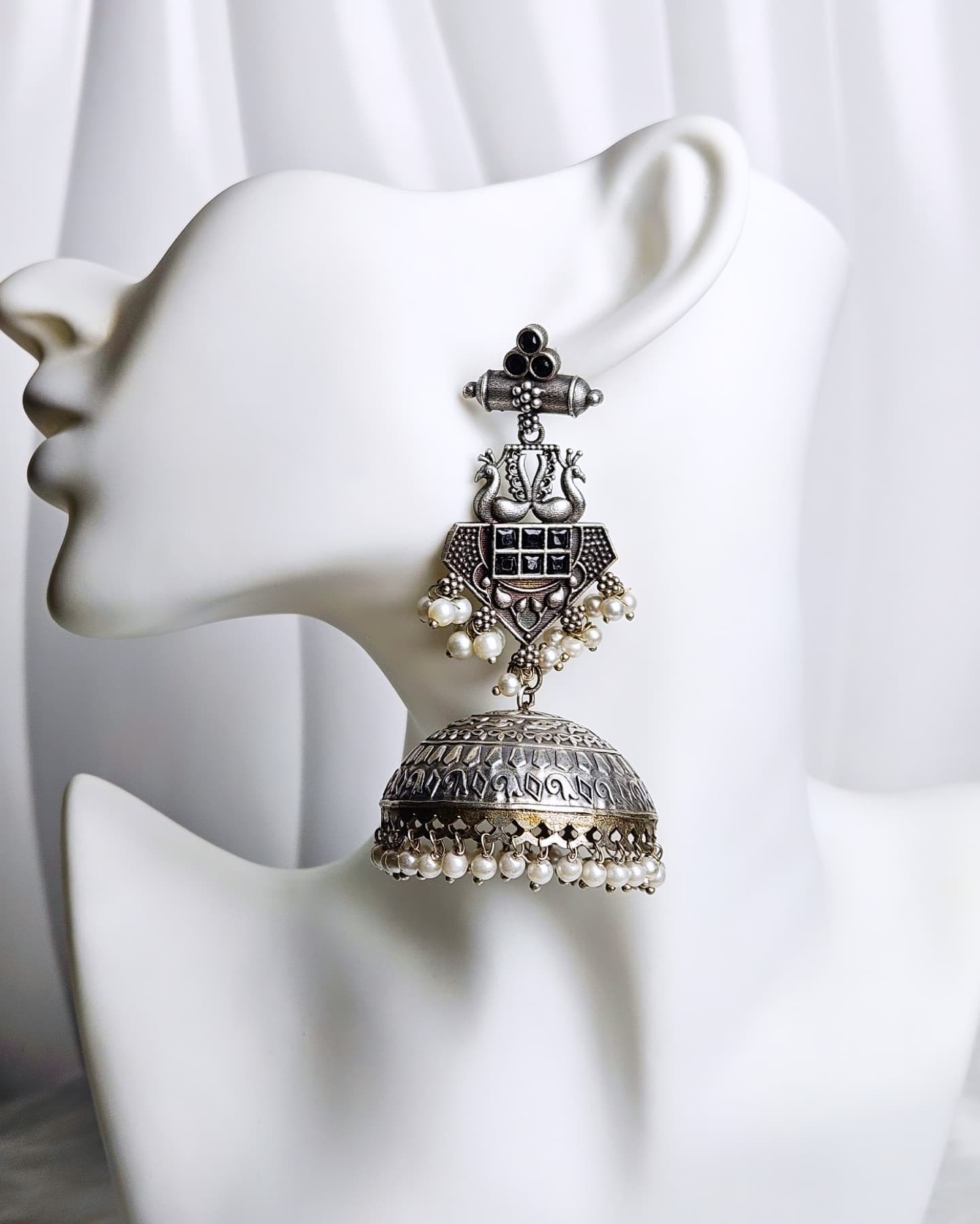 Elevate your ethnic look with these beautifully handcrafted German silver jhumkay designed with intricate detailing. Made from high-quality brass with a radiant silver finish, these jhumkay are lightweight yet durable—perfect for long hours of wear. The delicate engravings and subtle shine make them an ideal accessory for festive occasions, weddings, and everyday ethnic styling.