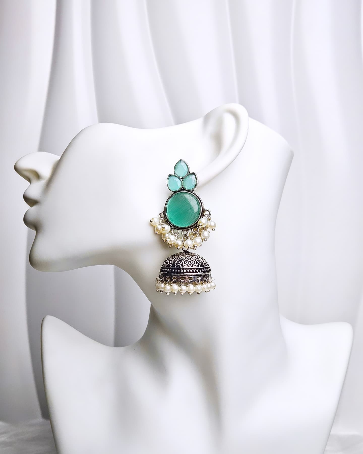 Elevate your ethnic look with these beautifully handcrafted German silver jhumkay designed with intricate detailing. Made from high-quality brass with a radiant silver finish, these jhumkay are lightweight yet durable—perfect for long hours of wear. The delicate engravings and subtle shine make them an ideal accessory for festive occasions, weddings, and everyday ethnic styling.