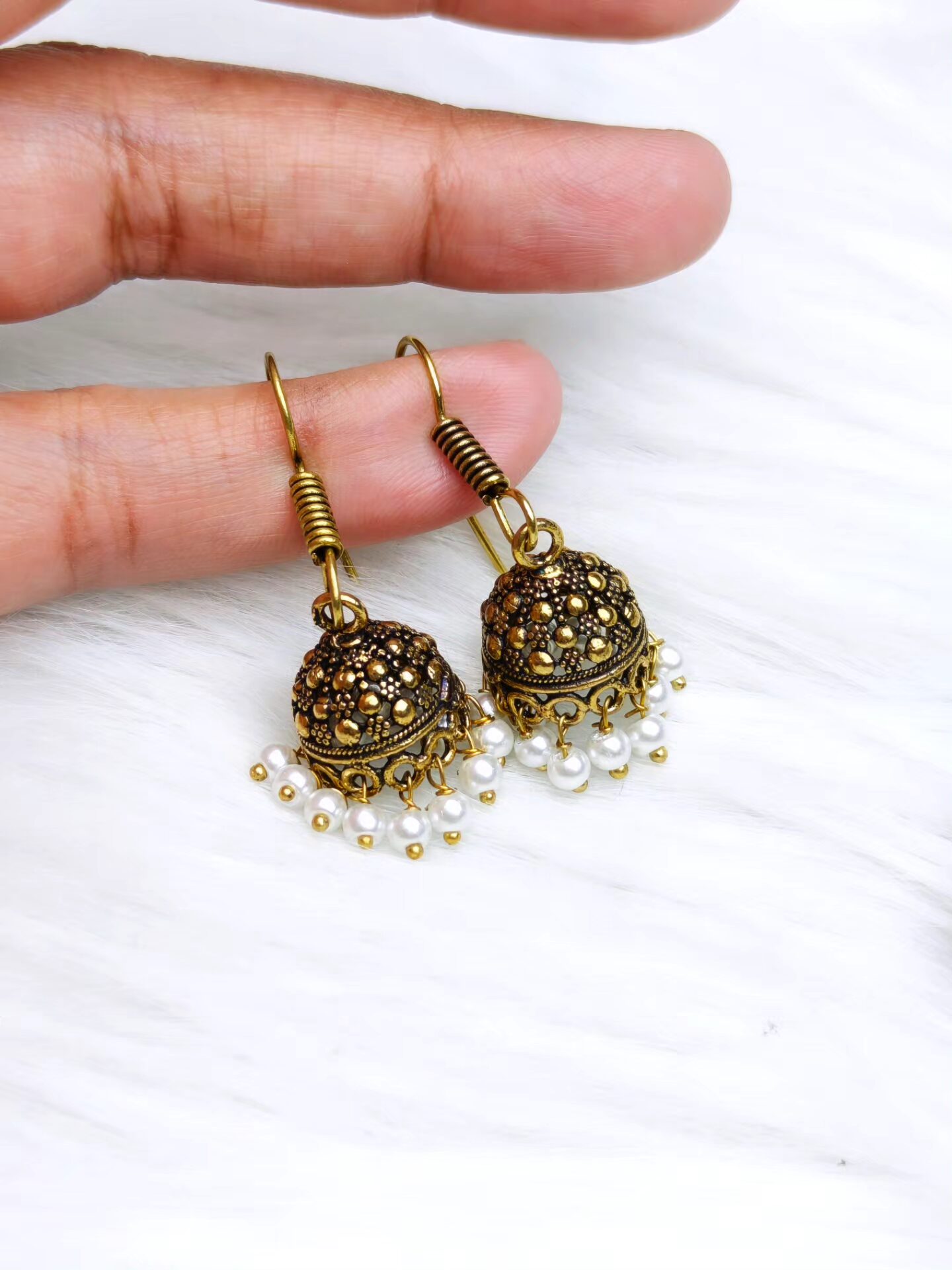 Our beautifully crafted small jhumkis with antique polish finish and intricate detailing are perfect pair with ethnic or fusion wear for a timeless, elegant look.