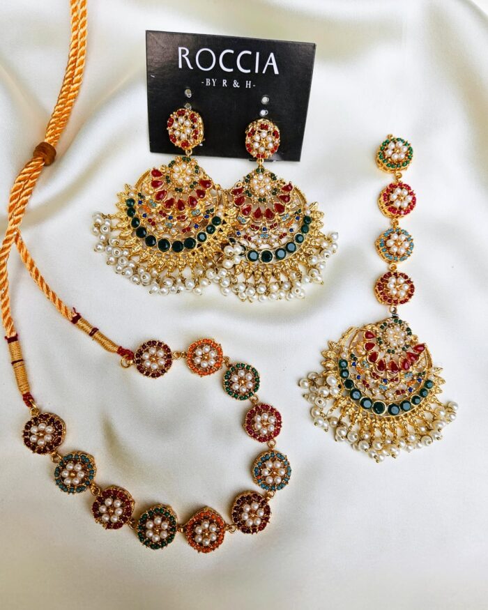 Add a touch of sparkle with this elegant Navratan Necklace Set, featuring navratan stones. Lightweight and versatile set in a gold-tone base with intricate detailing. It’s ideal for both cultural and festive occasions.