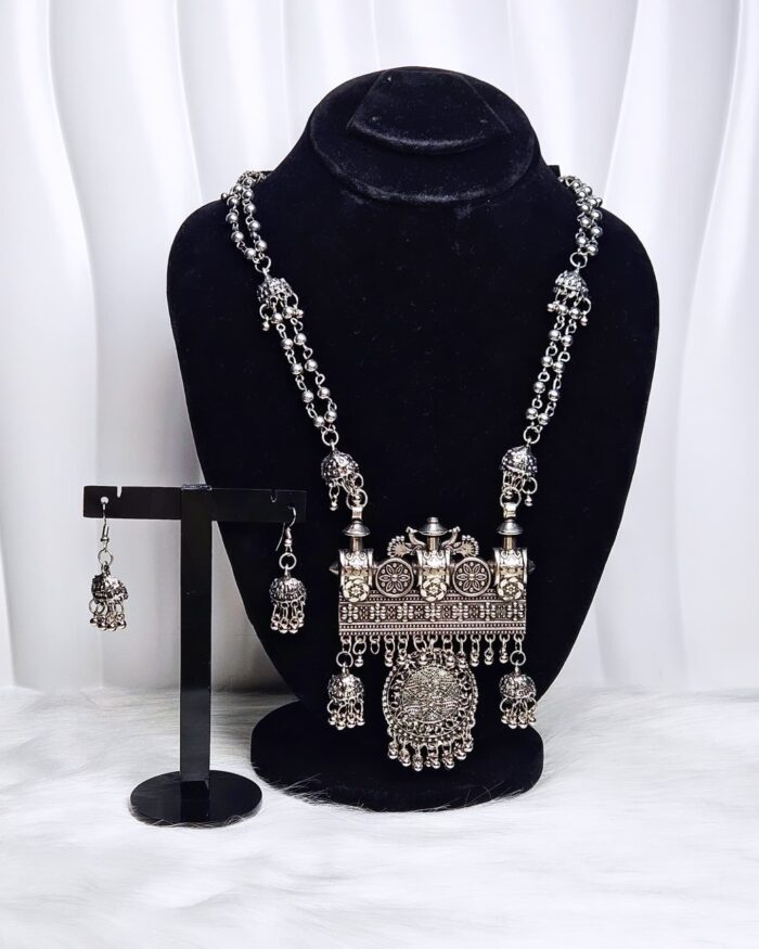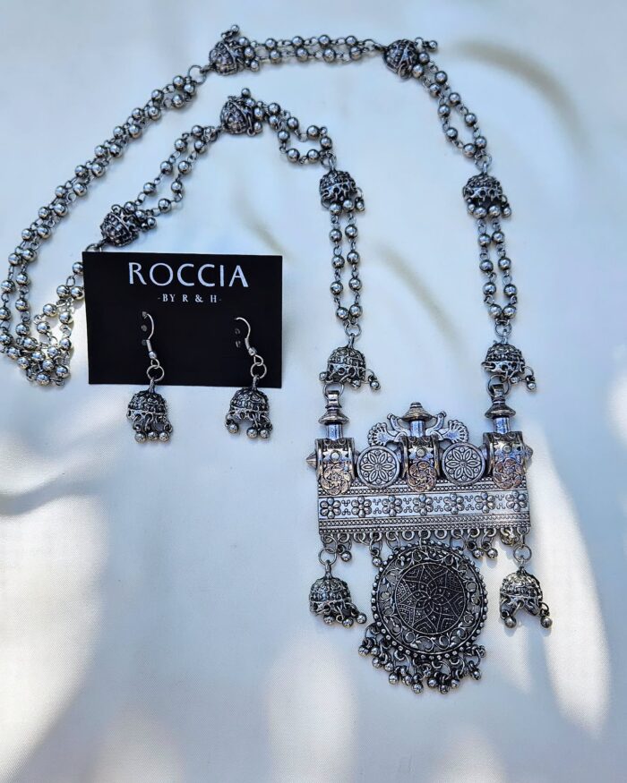 A beautifully crafted oxidised mala with antique polish finish and intricate detailing. Perfect to pair with ethnic or fusion wear for a timeless, elegant look.