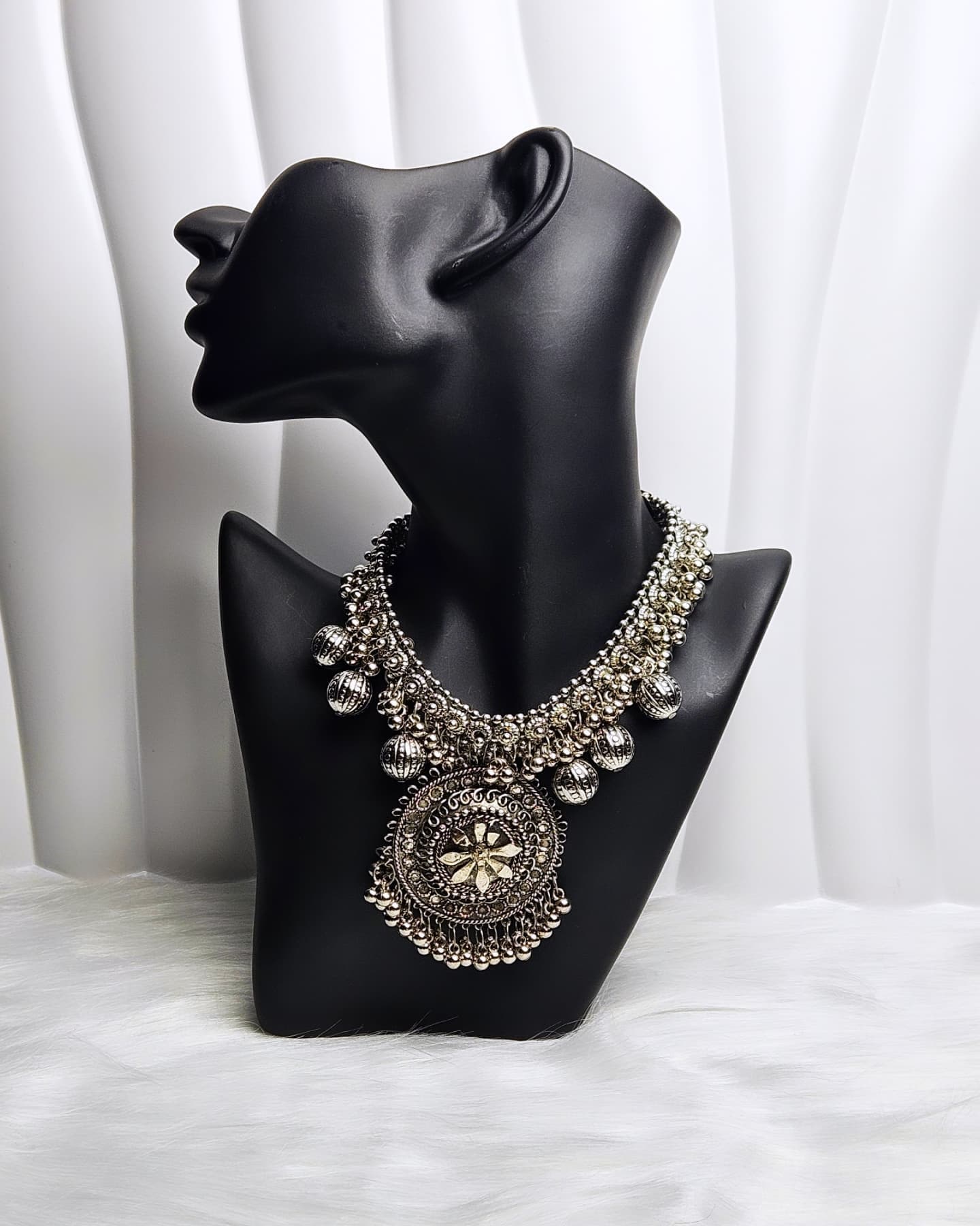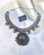 A beautifully crafted oxidised necklace with antique polish finish and intricate detailing. Perfect to pair with ethnic or fusion wear for a timeless, elegant look.