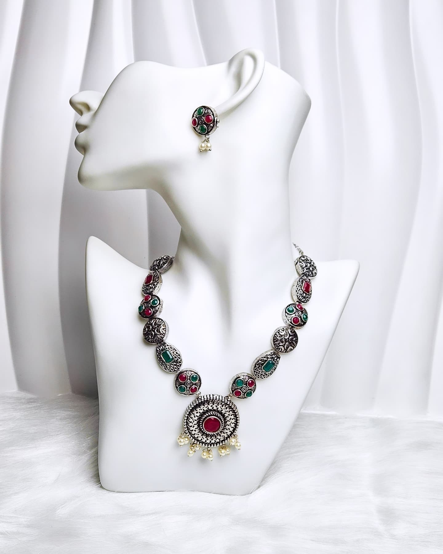 A beautifully crafted oxidised necklace with antique polish finish and intricate detailing. Perfect to pair with ethnic or fusion wear for a timeless, elegant look.
