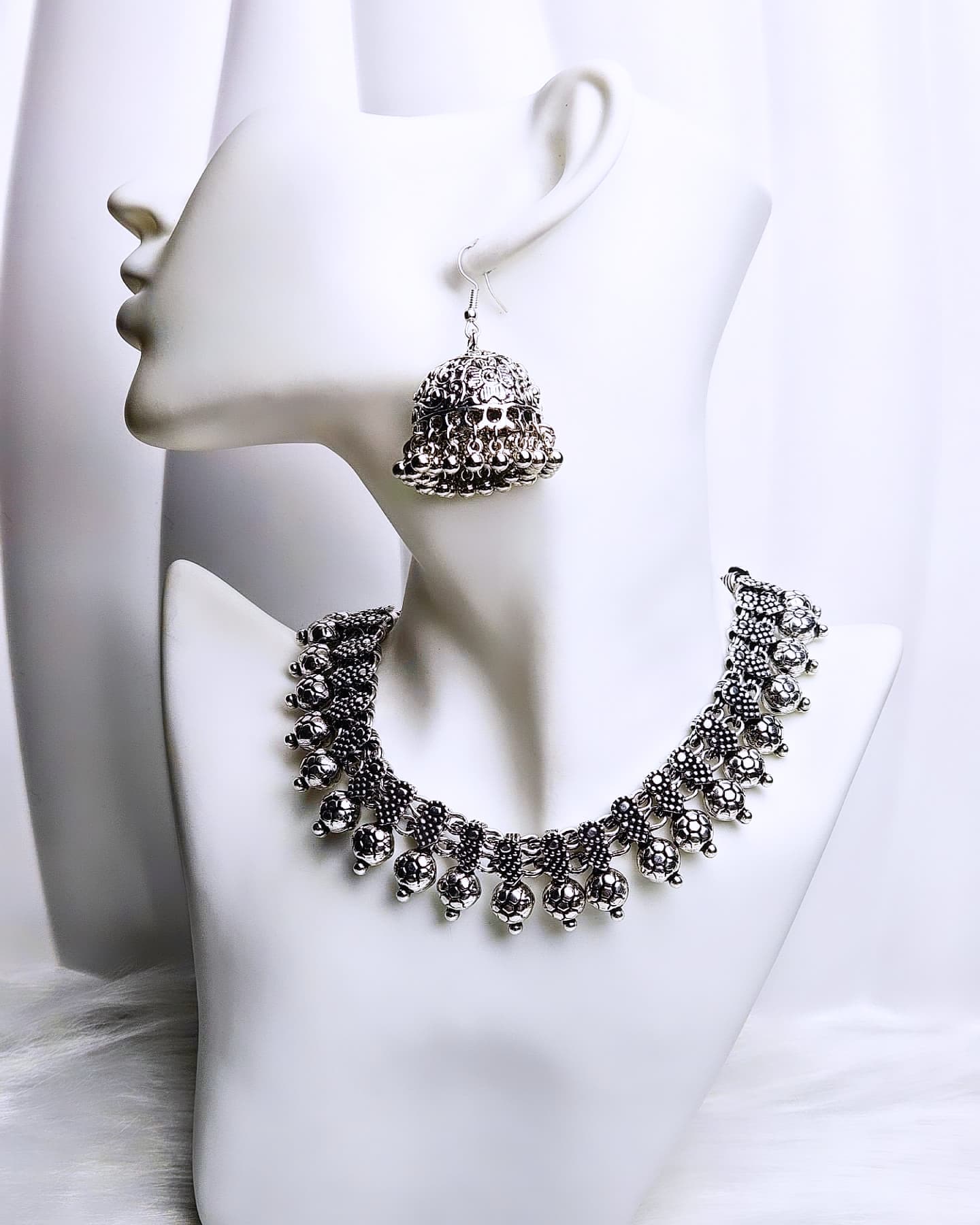 A beautifully crafted oxidised necklace with antique polish finish and intricate detailing. Perfect to pair with ethnic or fusion wear for a timeless, elegant look.