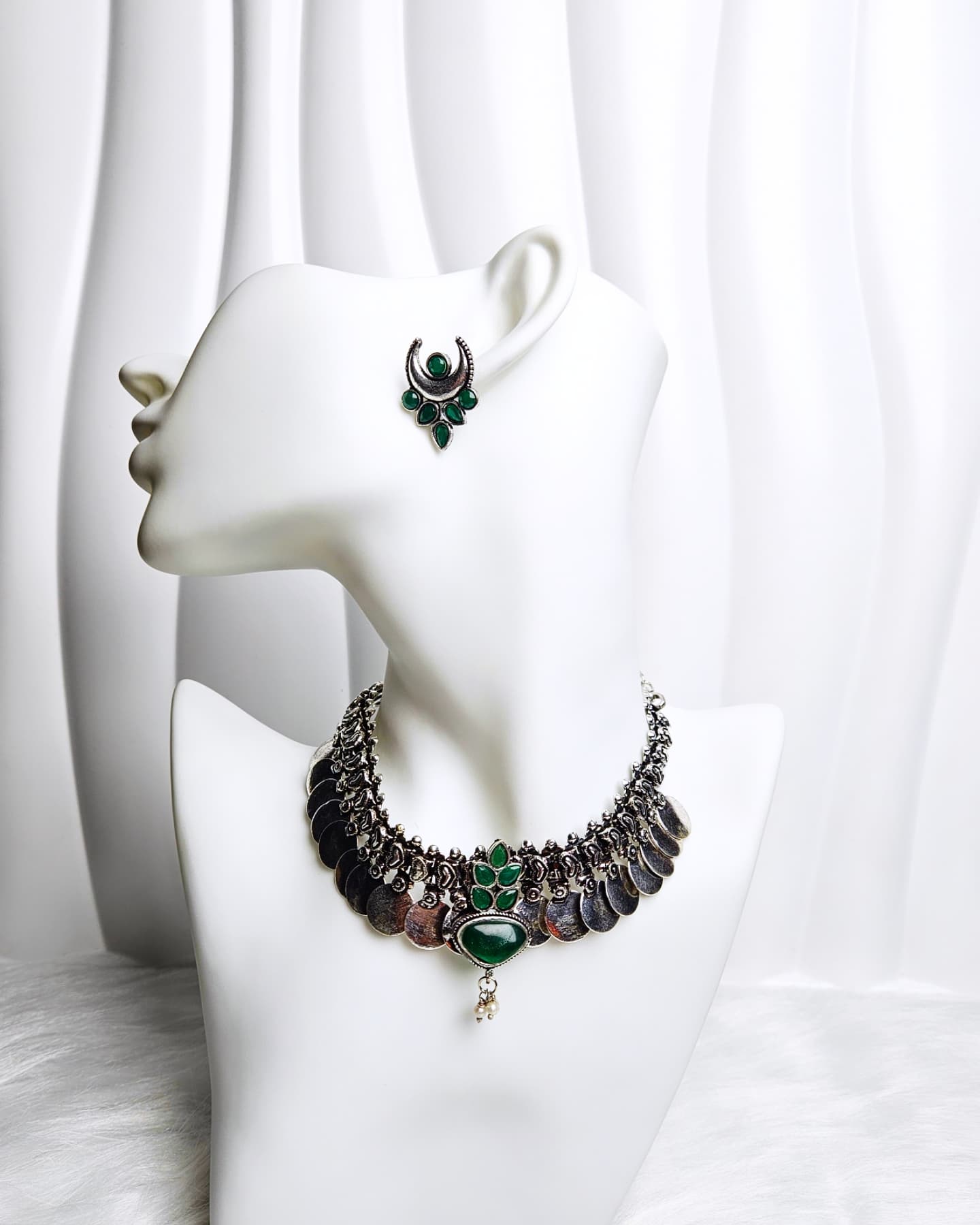A beautifully crafted oxidised necklace with antique polish finish and intricate detailing. Perfect to pair with ethnic or fusion wear for a timeless, elegant look.