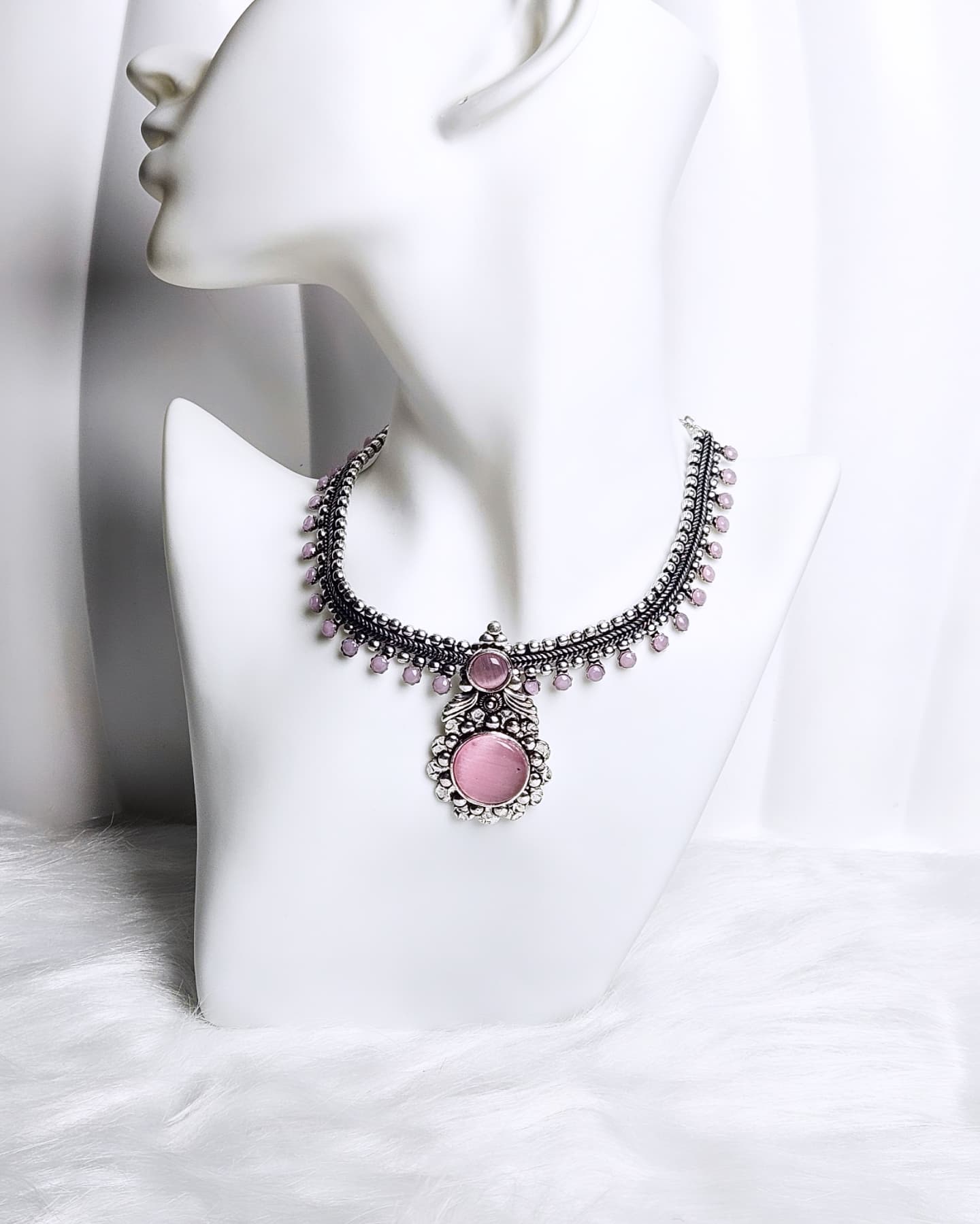 A beautifully crafted oxidised necklace with antique polish finish and intricate detailing. Perfect to pair with ethnic or fusion wear for a timeless, elegant look.