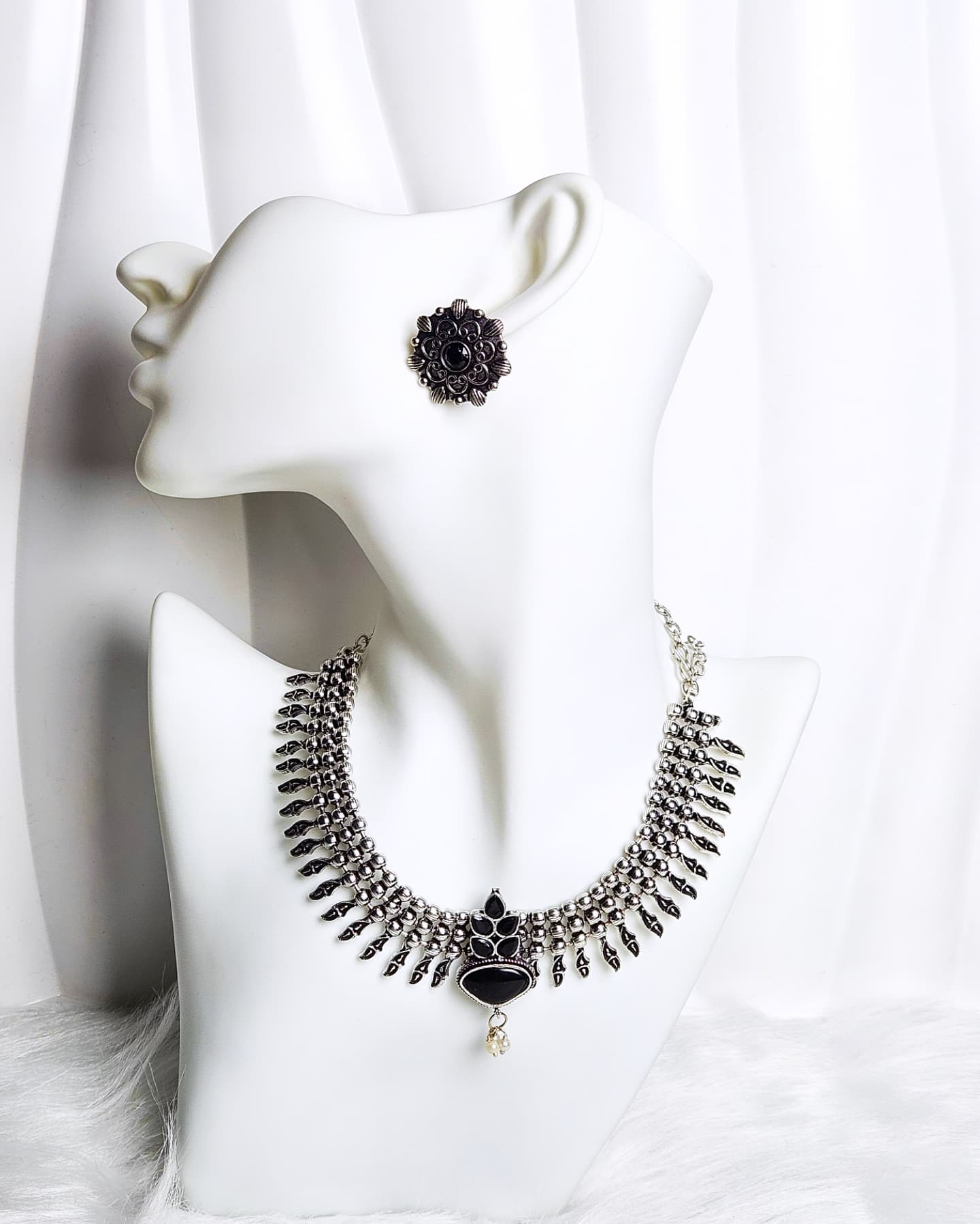 A beautifully crafted oxidised necklace with antique polish finish and intricate detailing. Perfect to pair with ethnic or fusion wear for a timeless, elegant look.