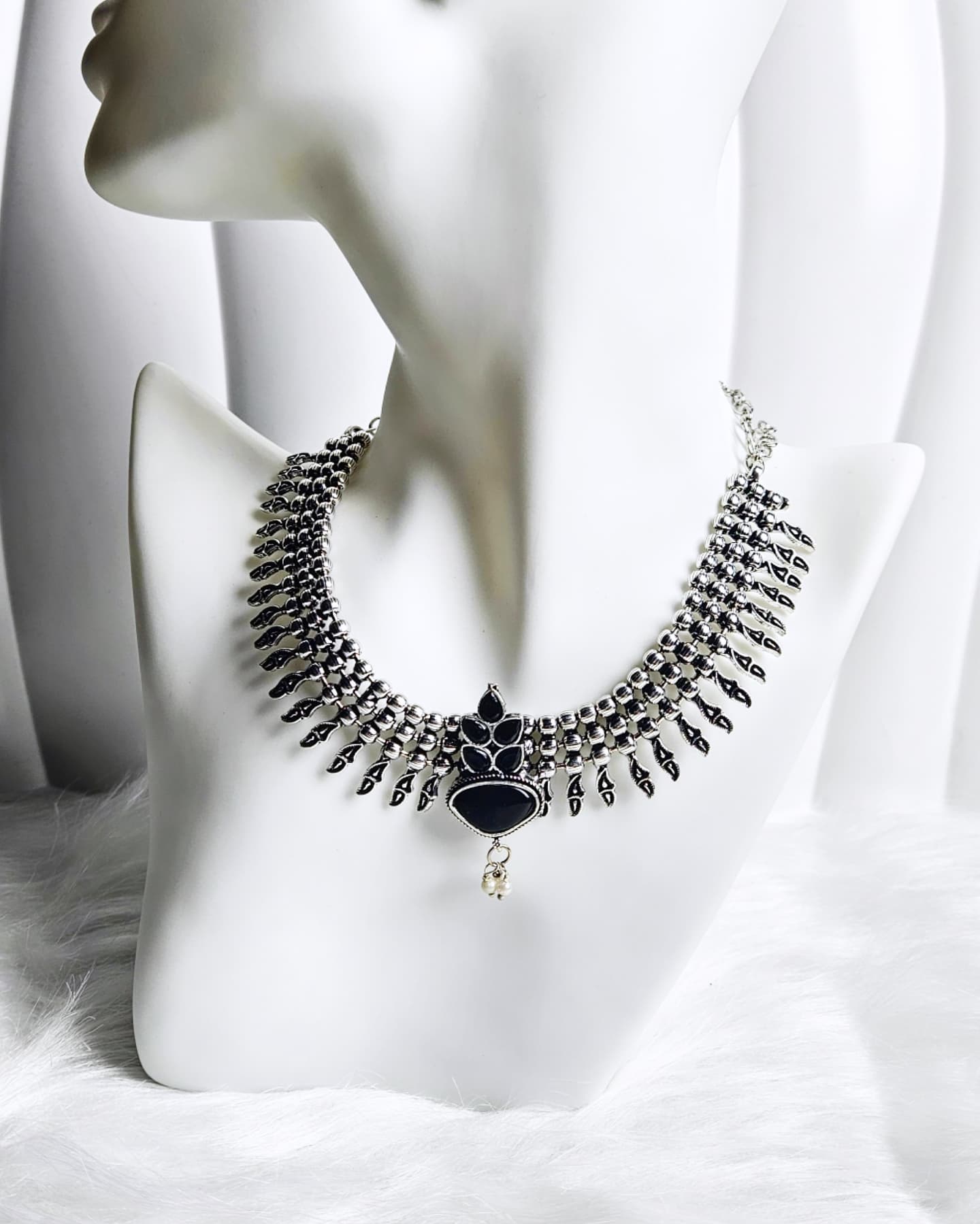 A beautifully crafted oxidised necklace with antique polish finish and intricate detailing. Perfect to pair with ethnic or fusion wear for a timeless, elegant look.