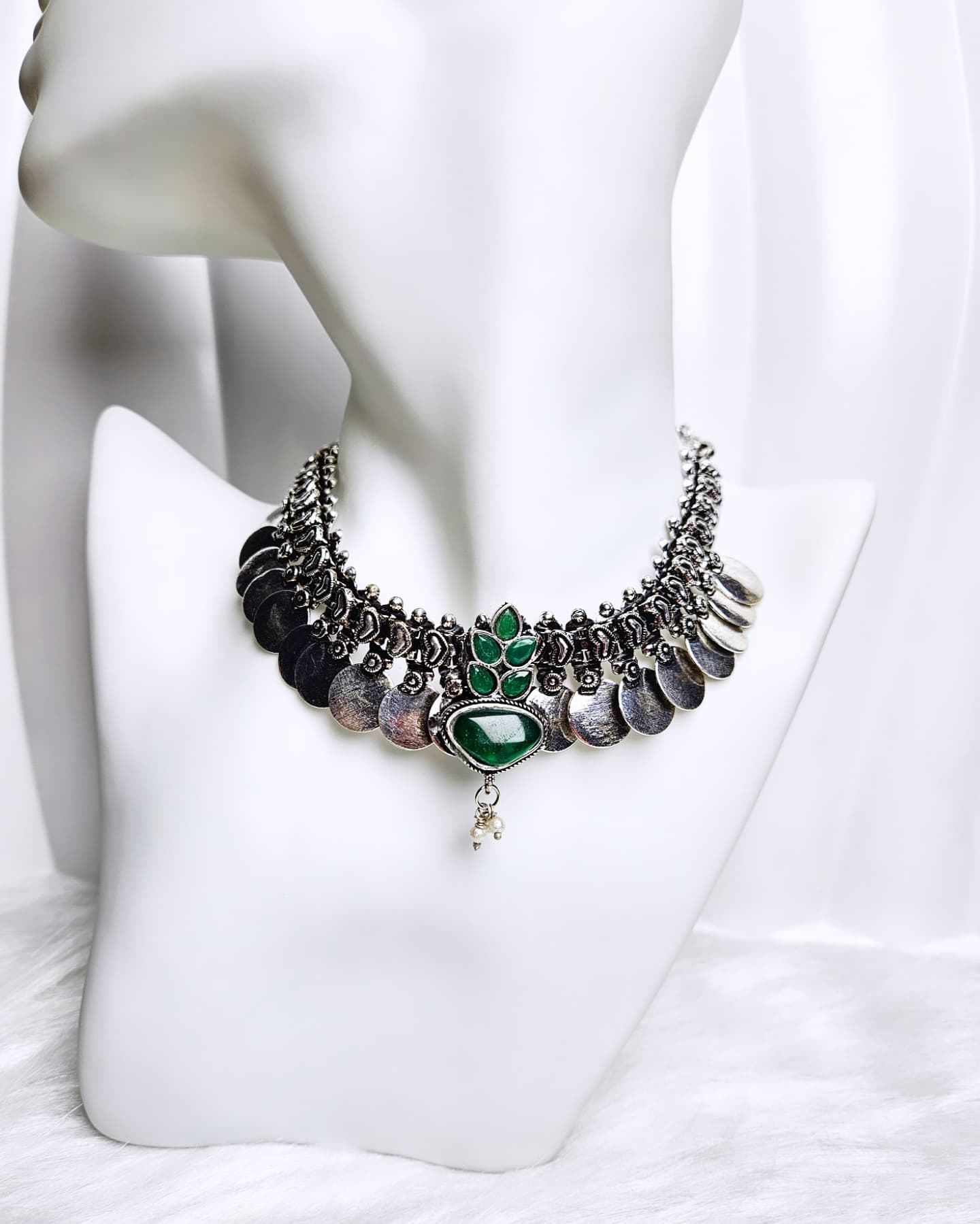 A beautifully crafted oxidised necklace with antique polish finish and intricate detailing. Perfect to pair with ethnic or fusion wear for a timeless, elegant look.
