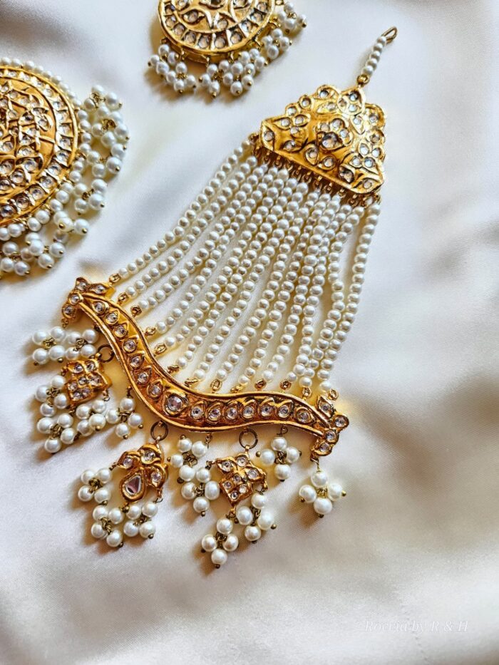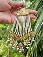 Farshi Kundan Jhoomar – A regal bridal adornment featuring intricate Kundan work. Perfectly blending Mughal elegance with timeless tradition, it adds unmatched grandeur and sophistication to every bridal look.